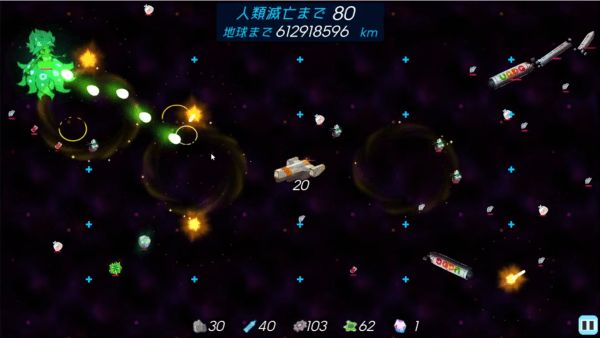- At the top of the screen is 人類滅亡 which is your time limit (in seconds) and 地球まで which is your distance back to Earth (in km).